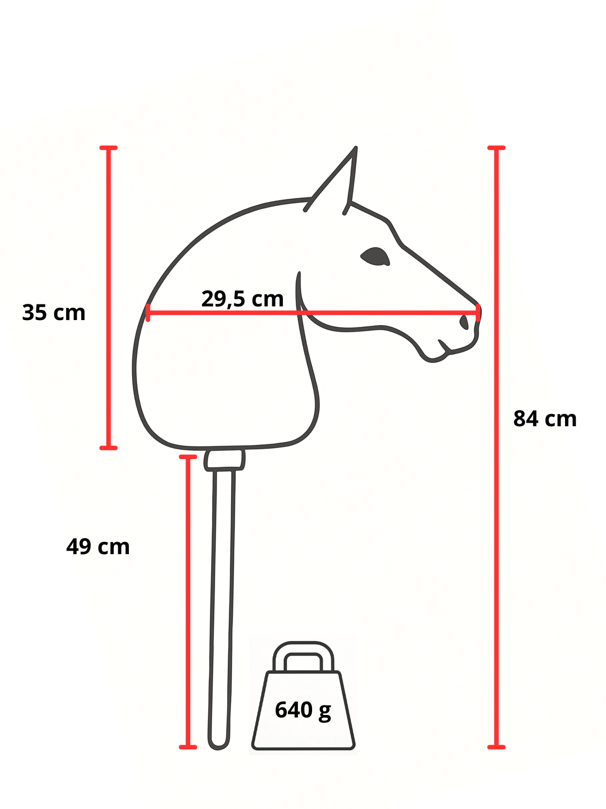 Celková výška je 84 cm, výška bez tyčky je 35 cm. Šířka je 29,5 cm. Tyč je 49 cm.